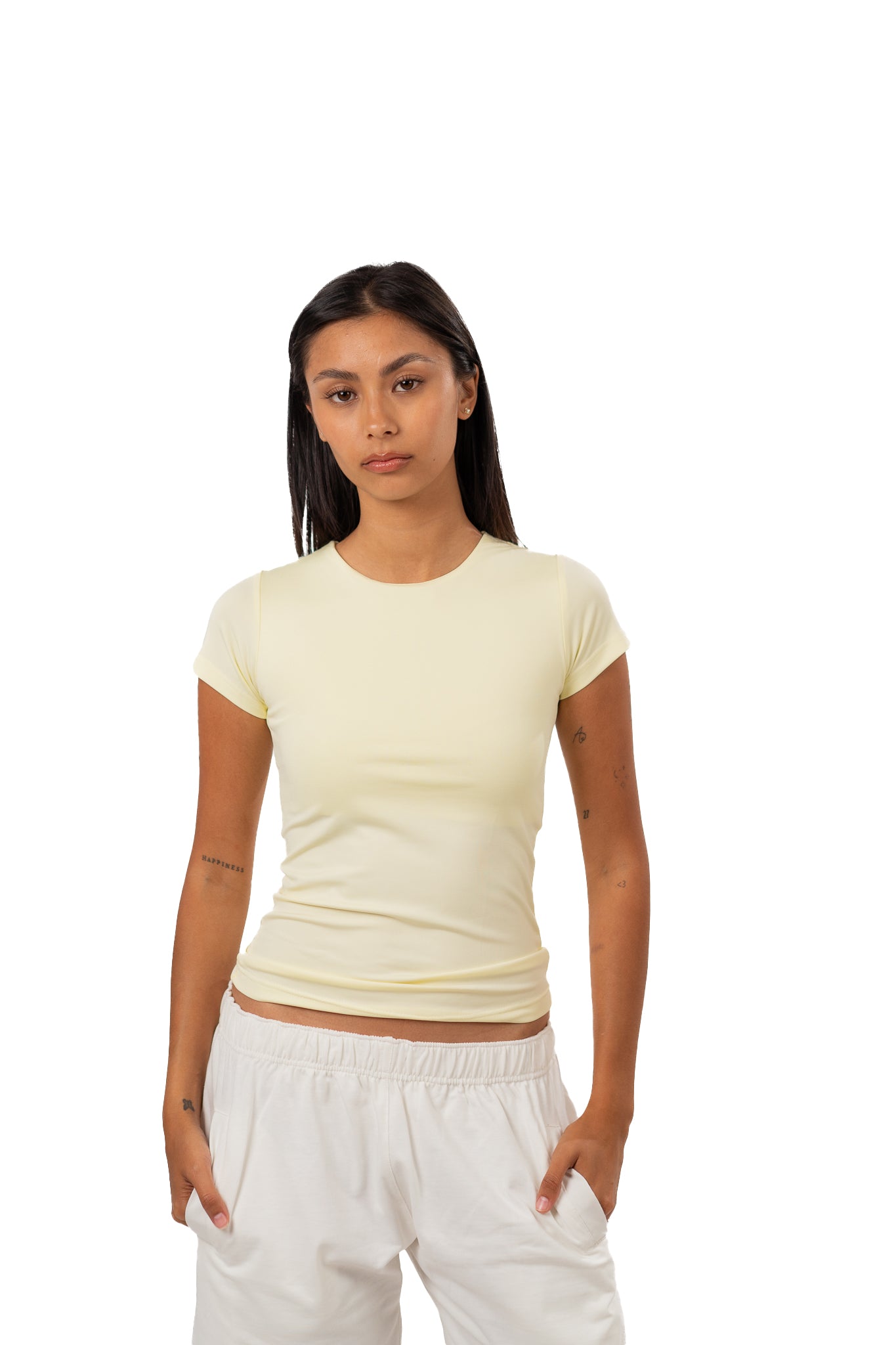 ROUND NECK CONTOURING SHORT SLEEVE TOP WITH A DOUBLE LAYERED BUST AND BACK